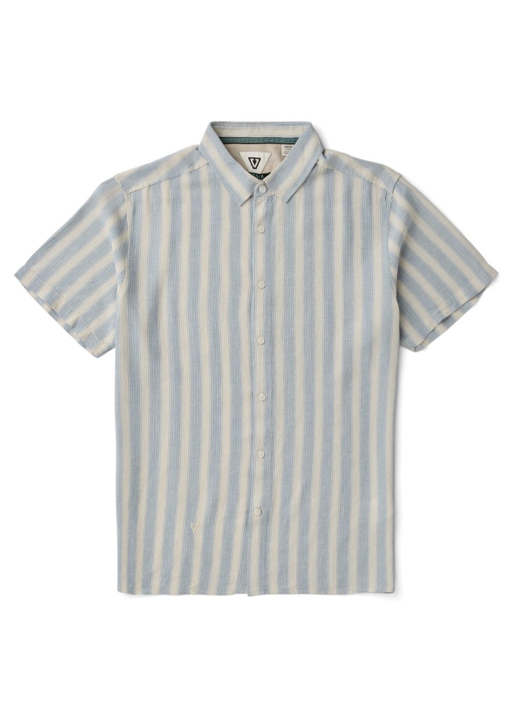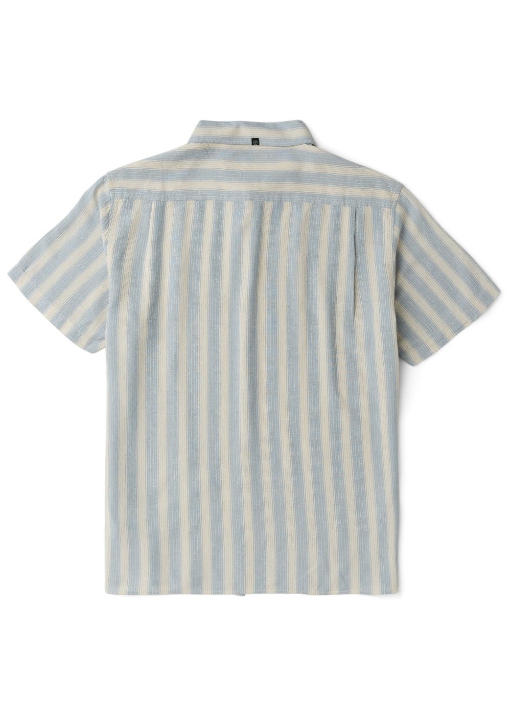 Elevated lines in rayon and linen. Yarn-dyed stripes run clean on this lightweight woven with a fold-over center front placket. Contrast chambray at the inside back yoke adds depth. Heavy silicone garment wash for superior softness.